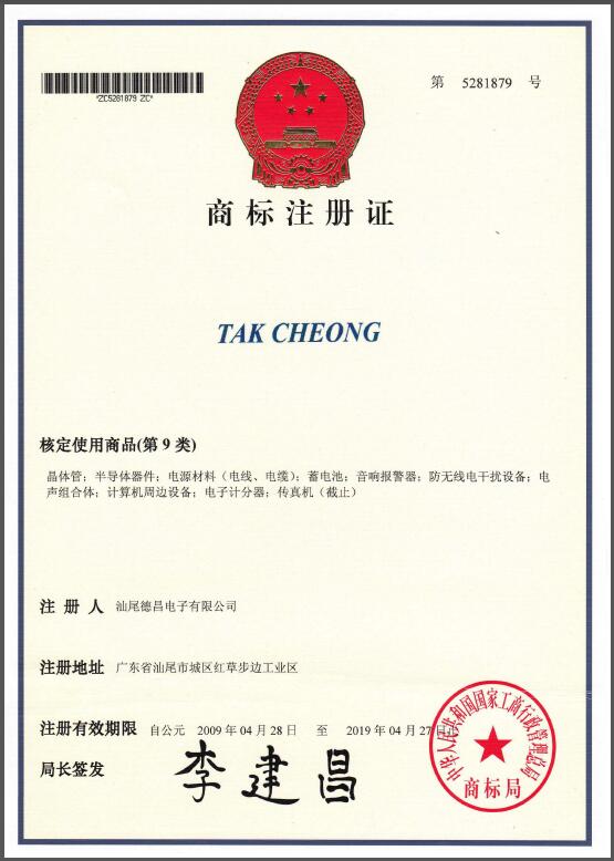 If there is any infringement of the trademark, Tak Cheong Electronics Shanwei Company Limited will pursue legal responsibility according to law.